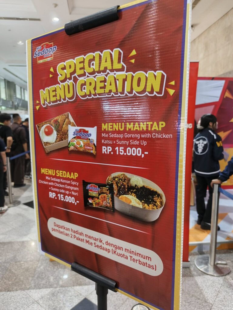 Yang paling pertama, rekomendasi ada di booth Mie Sedaap. Hanya dengan 15 ribu saja, kalian bisa mendapat 1 porsi mie instan lengkap dengan protein hewani dari ayam dan telurnya. Ada juga Yoshinoya yang menawarkan menu paket nasi mulai dari 30 ribuan. Kekurangannya kalau kalian mau beli makanan di sini, siap-siap antri terutama di jam makan. Tapi pelayanan mereka cepat dan sigap.